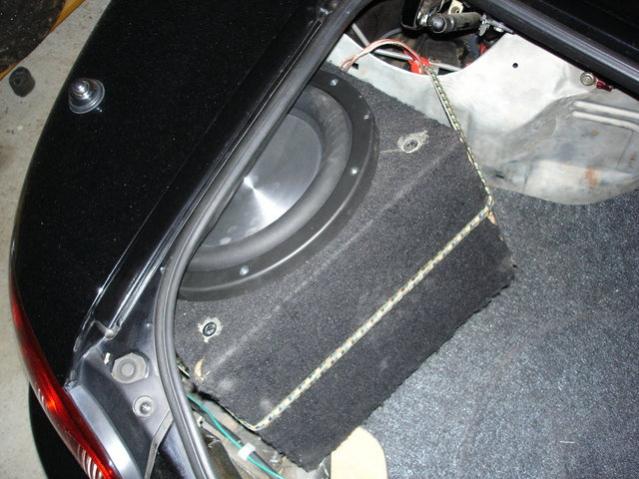 http://fixjunk.com/index.php?title=Miata_Trunk_Sub http://fixjunk.com/images/2/28/Trunk_sub_2.jpg The theory behind this design is that it complements the small size of the miata and the peaky low end cabin gain from the trunk and interior. If you design your sub to have a flat response down to 20Hz, you end up with a giant gain in the low end and you'll just waste amplifier power and rattle your trunk apart. More techy details of the testing done by Jason Cuadra can be found here: http://www.diysubwoofers.org/projects/other/cartf/ |