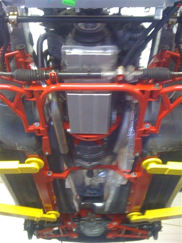 It's a simple steel framerail reinforcement and transmission x-member, for use with a 'Stang T5...