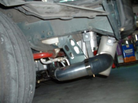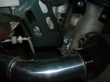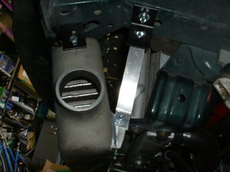 I made small L brackets to support the intercooler. Shaving Seconds welded mounting tabs to the intercooler end caps and I made aluminum angle supports to mount it to the brackets on the frame. I was lucky that it cleared the AC parts and fit under the bumper.