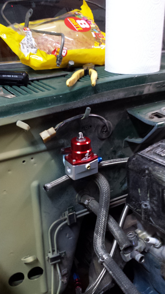 Replaced all of the fuel lines and got a new used gas tank that was in really good condition, all of the lines except running the length of the "frame rails" are braided stainless -8 or -6 lines and mounted the FPR: