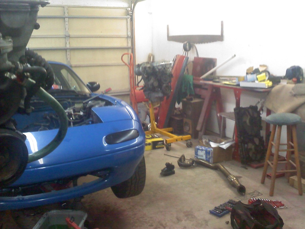 So made some progress today.. im thinkin all the oil the old turbo was blowing through the intake side may be why the engine failed.. all the plugs were just covered in oil.. yet 3 of 4 cyl had good compression.. anyways heres some pics of where im at... engine going in 2marr0...