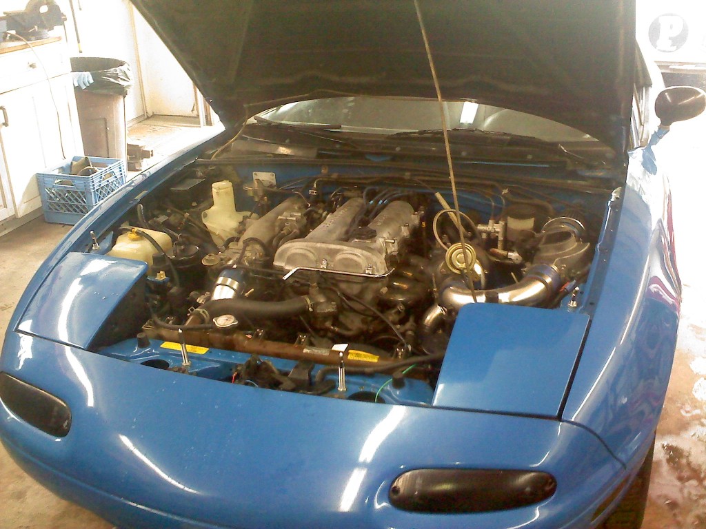 No boost yet... still breakin it in.. trying to properly seat these piston rings.. Fired right up, no smoke, no leaks, nothing to tweak. But even with no boost this motor feels mighty strong cant wait to start boosting the lil bastard. Not sure how long i should wait.. I know i gotta go easy on the new clutch for atleast 200mi so ill probly start putting a lil boost to her at that point. Anyhow me happy! Got me a good running miata again.. alls i got left to do is wire up the wideband 2marr0 at work..