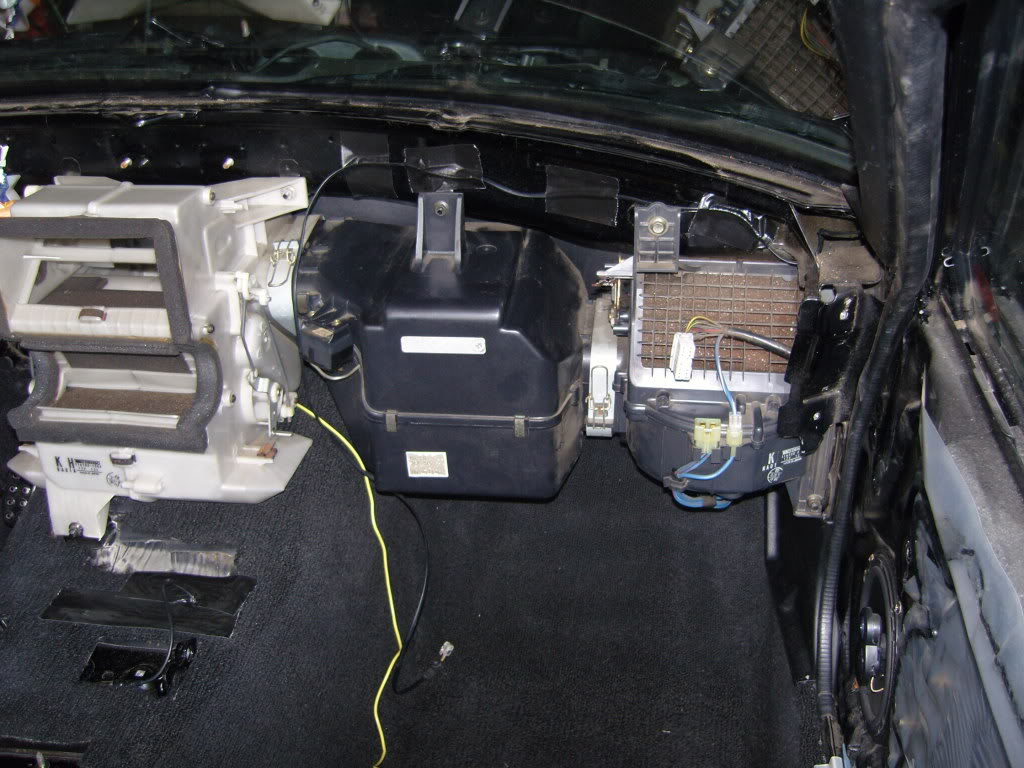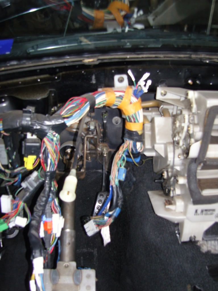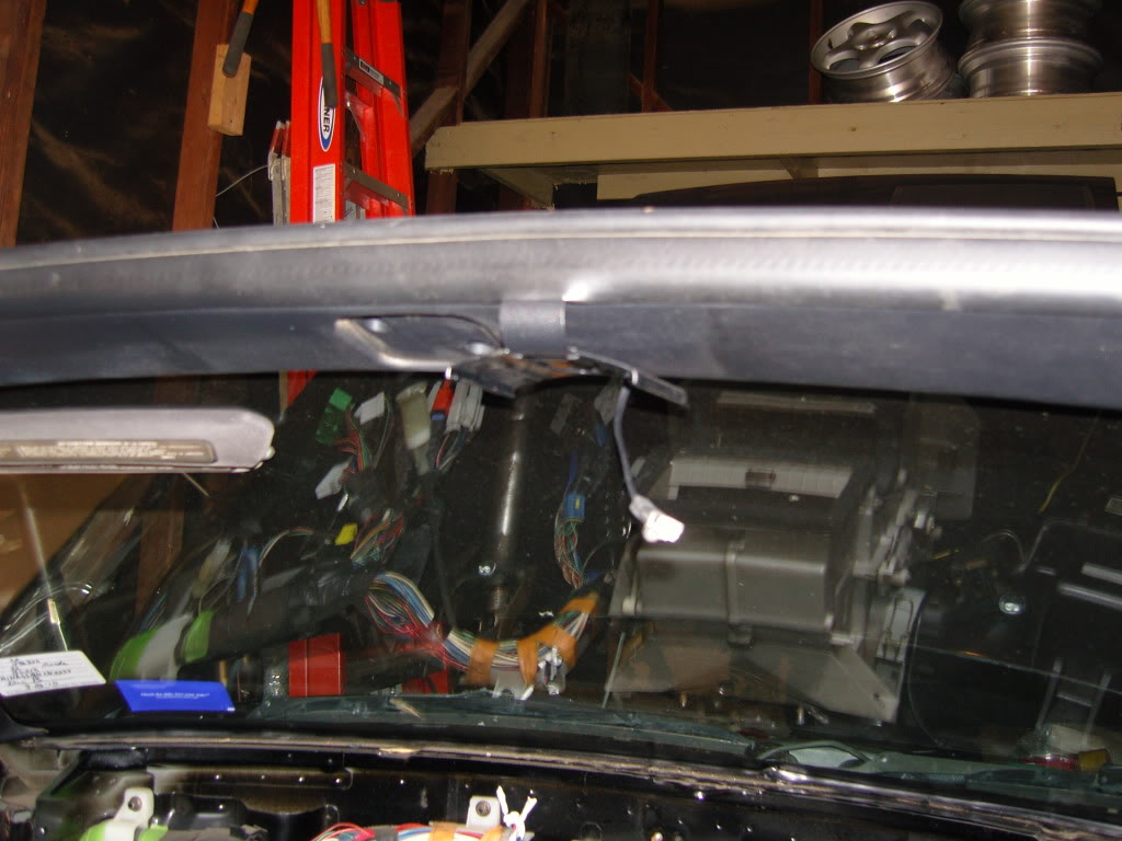 I cut into the harness to use the switched power from the airbag to power an auxiliary fuse box. Here’s the yellow power wire under the HVAC stack and the black radar detector cable under the blower.