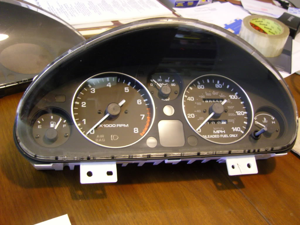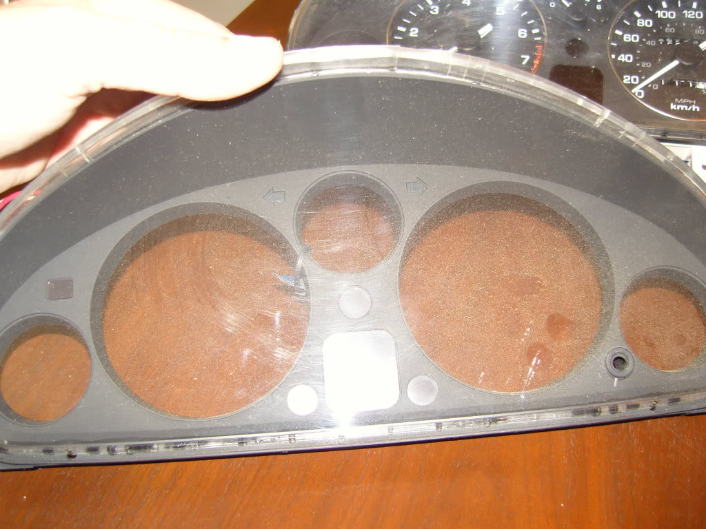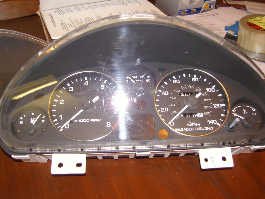 Here’s the ’90 Canadian gauges that I took the tach face from. The ’96 cover in the background was the only one I had and the clear cover was heavily scratched. I wet sanded it and buffed it until it was nearly perfect.