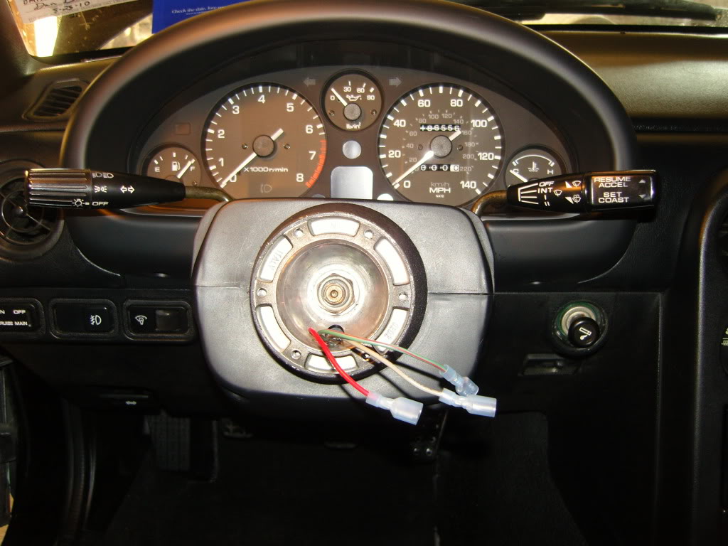 Here’s another thing I wanted to try. When you remove the airbag system, the clock spring remains and it’s got three wires that run through it. One is for the horn and the other two set off the airbag. I crimped spade connectors on all three. One is still for the horn, the other two will lead to a button on the steering wheel to mute the radar detector.