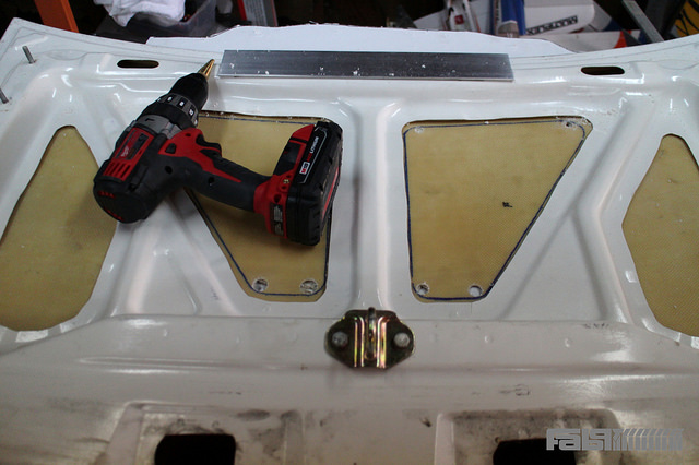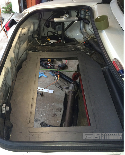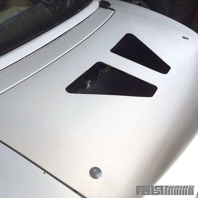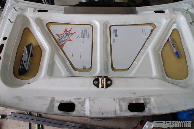 I've been working closely with an aerodynamics engineer from GM on the execution of this project and he surprisingly didn't even attempt to talk me out of it. We're going to be venting up through the deck lid because it's a low pressure zone. I'll use two high CFM puller fans to aid in the cooling and AN lines to route the coolant to the rear. A couple of beneficial factors come into play - It will clean up the bay quite a bit and lower under hood temps. This will also increase coolant volume to aid in cooling, restore some of the weight distribution to more useful areas of the car. But primarily it's just cool. The car is already pretty good at making people tilt their head and ask "WTF is in there?", this should take things up a notch. I first needed to find a good spot for the radiator and keep one big thing in mind - Bleeding the system is going to be a whole new bag of worms. To help with this, I've picked up a radiator with no fill neck and produced this little guy. It will sit at the highest point in the system and I'll fabricate an overflow in the trunk. https://www.miataforumz.com/attachme...ine=1399565001 Next I mocked up positions for the KOYO and welded my AN fittings on. https://www.miataforumz.com/attachme...ine=1399565001 At that point I jumped right into cutting out my trunk... This is a pretty rad feeling, (no pun intended) to just start chopping your spare tire area out of the car. After that was complete I needed a shroud that I'll bolt or weld into place. https://www.miataforumz.com/attachme...ine=1399565001 https://www.miataforumz.com/attachme...ine=1399565001 Everything is looking solid, I'm happy with the position, happy with the routing. To add some variety to my day I jumped over to the deck lid. This hot air is going to need to vent near the center of my deck lid for the best exit into a low pressure area. My aero guy believes that the air exiting here will also aid in aerodynamics because it will help fill the low pressure pocket, giving the rear of the car the desired "tear drop" shape. Cutting things that you only get one shot with is kind of my specialty. I usually don't measure twice because it psyches me out by over-thinking things. I mocked up these to get the shape correct. https://www.miataforumz.com/attachme...ine=1399565001 According to my from the hip measurement, here is about where these will sit. Looks fine to me I suppose. https://www.miataforumz.com/attachme...ine=1399565001 To get me started with the air saw and to help in corners I drilled some holes. I also applied masking tape to the other side so I didn't destroy the fiberglass by chipping. https://www.miataforumz.com/attachme...ine=1399565001 Chopped them out and mocked it up. Looks alright to me. Now I needed to put some mesh in here. I can just imagine the next car show I go to, some kid decides to drop his burger into my trunk and my cooling fans act as a food processor.. https://www.miataforumz.com/attachme...ine=1399565001 I went with an aluminum mesh that's powdercoated. As expected, it came out great. https://www.miataforumz.com/attachme...ine=1399565001 I also removed my latch and hinge system completely. I did this for a number of reasons. 1, my previously useless trunk space was not completely useless for storage so I won't be opening it as frequently. 2, the hinge system was jacked, the previous owner drilled new holes for the striker and nothing lined up properly. I went with the same latching system I used for my front bumper. https://www.miataforumz.com/attachme...ine=1399565001 https://www.miataforumz.com/attachme...ine=1399565001Quik latch by fab9tuning, on Flickr Here you can see the strikers and the piece of aluminum up top. Basically it functions by first sliding the back into the piece of aluminum and then closing the deck lid as it originally functioned but instead it locks into place with the latches. https://www.miataforumz.com/attachme...ine=1399565001 Later this week the car is being dropped off for paint. I'd do it but I simply don't have time. |