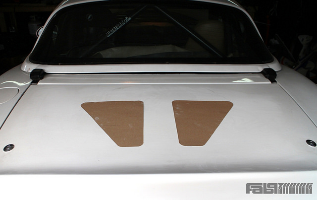 Chopped them out and mocked it up. Looks alright to me. Now I needed to put some mesh in here. I can just imagine the next car show I go to, some kid decides to drop his burger into my trunk and my cooling fans act as a food processor..