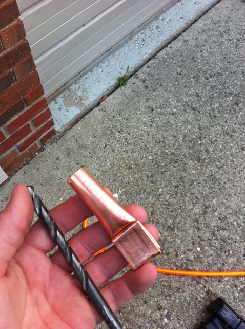 I ended up spending around 40 bucks but you can do it cheaper. I started with the copper pipe, the idea is to attach one end to the engine block somewhere and the other to the air compressor hose. I flattened the end with a hammer and made a couple of folds to drill through.