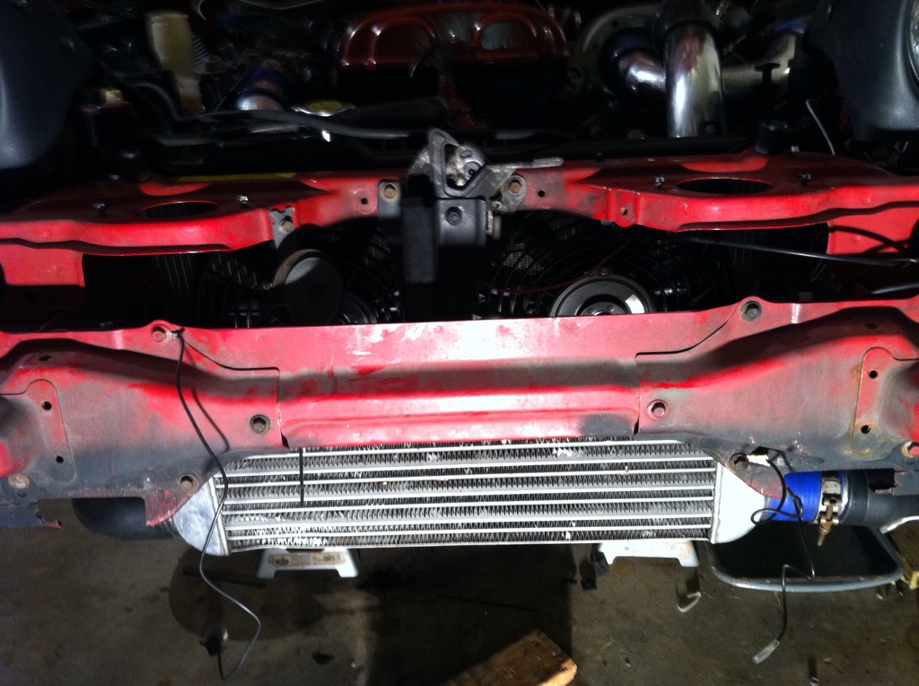 hit a raccoon about a week ago and took out my radiator, and a small leak in the intercooler. Heres the remount of the intercooler. you can see the pusher fans also