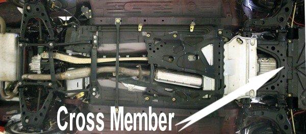 Assuming you’reusing jackstands….loosen the front passenger side wheel lug nuts slightly,while the tire still has weight on it. Turn the lug nuts counterclockwise. Then jack the front of the car up, placingthe jack under the front metal crossmember shown circled in Figure 1 below. Thanks to FM for Figure 1.