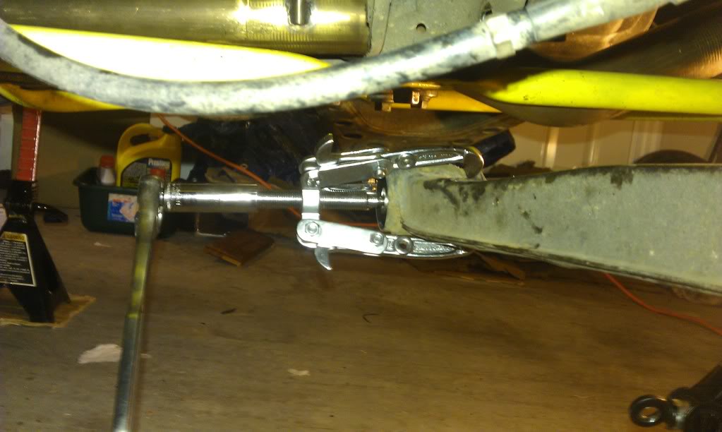 Rear Coilovers 1) disconnect the sway bar endlinks from the control arms 2) Up top, remove the two bolts holding the tophats to the chassis 3) remove the lower coilover bolt 4) remove the upper control arm bolt 5) push down on assembly, pull coilover out. Tools: Assorted Sockets (14mm and 17mm in the regular and deep style, 21mm) Rubber mallet/deadblow Big screwdriver for leverage 3-jaw puller or hydraulic press or whatever gets the old bushings out C-clamp for putting bushing sleeves in (Not required, but VERY helpful). NOTE: Do not tighten anything down unless you are using the bolts to get the sleeves or bushings into place. Anything that I reconnect to help with leverage or for breaking other bolts loose, is simple pushed in and has a nut threaded on to keep it from falling. SO once again, do not tighten anything down until the end. ---------Upper Control Arm---------- -You already have the knuckle off at this point, so go ahead and get that bushing out. https://www.miataforumz.com/attachme...ine=1320377301 -To break the two bolts at the chassis is a bit tricky. If you connect the knuckle back on, it puts weight on the bolts and you have to thread them out every mm, but using a socket wrench it will get stuck like this: https://www.miataforumz.com/attachme...ine=1320377301 So best here is to use two wrenches to break it loose. If thats not an option, connect the knuckle to keep the CA under control, break them loose, then disconnect the knuckle to get the bolts out. Reconnect the knuckle to the CA again so you can have something to jaw on. Lets recap 1) reattach knuckle with the bolt (skip to step 4 if you have two 14mm wrenches) 2) break chassis bolts loose (using either reattached knuckle for a counter) 3) remove the knuckle bolt 4) remove the chassis bolts 5) reattach the knuckle 6) jaw the two bushings out https://www.miataforumz.com/attachme...ine=1320378848 https://www.miataforumz.com/attachme...ine=1320378848 -Now, you have the bushings and sleeves in the Rear Upper Control Arm. If you attach the knuckle first, you will have a HELL of a time getting the two chassis bolts to line up. So as implied, with upper CA completely unattached, start by putting in the two chassis bolts, but don't tighten them obviously. ---------Lower Control Arm---------- -I started at the knuckle for the lowers. this is the "long bolt". Its usually the pain in the ass bolt and some people say they are bent. I didn't have much problem getting it out, but then again...I guess mine isn't bent. -Once you remove this long bolt, its going to release the knuckle so make sure you support it (remember you have already loosened the upper CA, so its not good for much other than keep it within a radius). It won't really fall or anything as there is still some friction between the knuckle and the Control Arm. -The big problem with this one is that the lower you push the lower CA, the more the knuckle will drop. Pain in the ass at first, but its easy to fix...remember that screwdriver I was talking about earlier? you will be happy to see the solution is as easy as a leverage bar/screwdriver and your good old floor jack. See picture: https://www.miataforumz.com/attachme...ine=1320378848 Voila, now you have access to these fuckers: https://www.miataforumz.com/attachme...ine=1320378848 https://www.miataforumz.com/attachme...ine=1320378848 Easy eh? well the hard part here is getting the damn knuckle back in the CA. First, its going to pinch on the new bushing, since the bushing hasn't been compressed much, it has a tendency to flare out too far and the knuckle won't fit. Easiest way is to get one side on, then use the screwdriver again to leverage the knuckle into the other side. Second... MAKE SURE YOU LUBRICATE THE OUTSIDE of these bushings. The only time you have to put lubricant on the bushings IS NOW. otherwise you will not (unless superman helps) be able to align the knuckle with the bolt holes through the CA. My typing is confusing, I am sure. so let me diagram: https://www.miataforumz.com/attachme...ine=1320378848 -Done? lets move on to the chassis side of the lowers then! this is really...easy. Just make sure you get a second support for this, as they have a tendency to keep sliding down since you are loose (plus my ES bushings don't preload as the sleeve is seperate from the poly, unlike sleeve impregnated into the rubber with the stockers). Lookies: http://i277.photobucket.com/albums/k...s/IMAG0520.jpg -support the other side, support at the front knuckle, attach jaw, pull, rinse repeat (shouldn't have to mention this, but MARK your Eccentrics). Attachment 7073 |