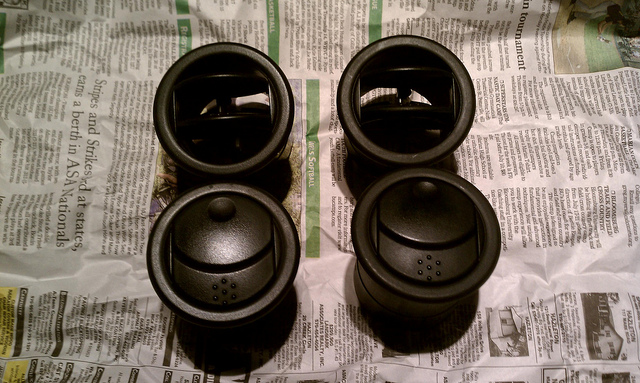 First, remove the eyeball vents from your Miata. This job usually requires some force, but try to be as careful as possible. If you want the vents to rotate, you'll want the clips inside the dash to be intact. I used the wire method (loop wire through the eyeballs) and straight pulls but still ended up with one broken clip. After the fact I found that if you pop the outer ring of the eyeball vent off, pull the eyeball out, and then rotate the sleeve, it slides right out with no fuss. I'd recommend that method.