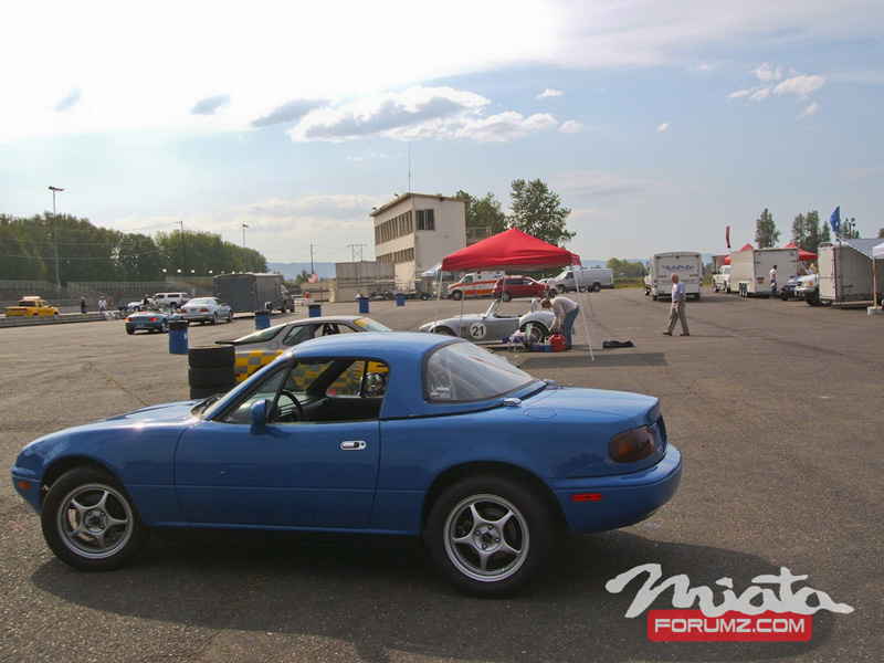 At this point, after some forced driving of the Miata, I grew to like it a bit, but it still wasn't my first choice of car. As a senior graduation present, my dad said he was going to pay for an autocross day. My friend Mike heard about this, and suggested instead a track day at Portland International Raceway. So my very first outing was 06/03/05. I went with Mike in his Firebird and our girlfriends at the time.