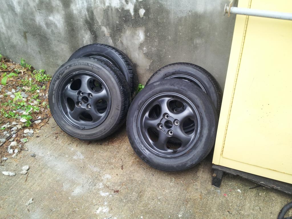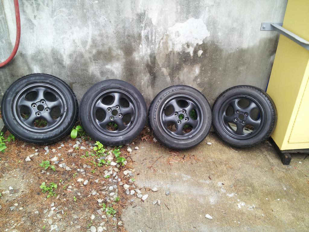 I have a nice set of pretty light miata wheels for sale. weight 12.7lbs a piece. they are 14x6 inch 45mm offset 4x100. plasti dipped black . 3 tires have about 40% and 1 with 10%.
