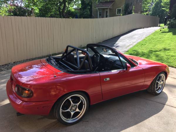 (TL;DR I have some problems, skip to the end to see them. They are numbered.) I just bought my first NA Miata on 5-20-17, a Red 1997. I bought from an ex-STS autocross racer so it had a few mods: Hard Dog roll bar, Ground Control coilovers, Eibach springs and adjustable sway bars, Racing Beat sway bar end links, Bosal Exhaust, Some intake, ASA 17x7 wheels with 205 Yokohama Parada tires. Attachment 7029 Attachment 7030 Attachment 7031 I'm 6'2", 250LBS and I just did a super aggressive Foamectamy mod which pushed me a good two inches under the roll bar and a good inch or two back and gave me so much more support and comfort. I also removed the plastic door trim to give my left leg more room and I chopped and re-glued the dead pedal to give me some more room. I'm going to change ALL the fluids this week. I live in Ohio and this is my daily driver, so I'm putting in Mobil 1 10w-40 with the M1-110 filter for the summer and I'll swap it for 5w-30 in the winter, i'm putting in that Ford XT-M5-QS magic sauce in the trans, Mobil 1 75w-90 GL5 for the diff, Mobil 1 ATF for the PS system and some Prestone green for the coolant. The AC is broken but I think the 97's take normal R134a so eventually i'll pull a vacuum, recharge it and put some UV dye in to check for leaks and fix them. There is also this "Python" electronic key system under the steering wheel that doesn't work, I'm going to try to remove it and clean up the wiring. That panel is also missing but I heard its heavy so i'm going to make a replacement myself out of some sheet metal. There's also a mess of wiring in the tombstone for the radio, when I bought it the radio didnt work so I just pulled it out, i'll look into cleaning up the wiring later. The plan down the road is to get a RetroSound Hermosa so keep the old-school Aesthetic. There is no ABS fuse in the fuse box so i'll order one on Amazon and put it in the car whenever. I've driven and raced with no ABS before so I don't really need it, but it's a peace of mind thing. It needs an alignment desperately as it has way too much camber for daily driving. My plans are -1.2F, -1.75R, 5.1 Caster and -.02F, .23R for toe. The steering doesn't return to center as fast as I would like so I'm hoping maxing out the caster and getting an alignment will fix that. The car has some issues and I would like some advice as to what to do. 1- The airbag light is lit up on the dash, I think this is because the passenger side seat does not have the cable going from the buckle receiver to the plug under the carpet and the driver's side does. It's not flashing, just solid lit. There is also a blue plug under the hood that is not connected to anything and I think the airbag plugs are blue or orange IIRC. Should I try to find an OEM buckle receiver or just stiff it? There is also a white plug disconnected under the hood. I'll get some pics and post them up, hopefully someone knows what they are. 2- The door handles do not work from the inside. If I move the switch to the locked or unlocked position, nothing happens. The only way to lock or unlock the doors is from the outside with the key. Should I order new interior door handles? The locks obviously work, I think the interior plastic parts are just broken. 3- The power windows are really slow and the switches are kinda janky. I know I should take the door cards apart and grease the rails, but what grease should I use? The switch doesn't actually move the window until after I press it about three to four times. My plan was to go in there and clean the contacts and make sure all the connections are solid and re-solder any if needed. 4- None of the interior lights work. The dome light on the windshield doesn't work, and neither does the light in the ashtray. Anyone have a link for an LED replacement for these? 5- When I did the foamectamy I found out my car has those bars bolted to the transmission tunnel. I snapped the passenger side bolt in half as the threads in the tunnel were rusted and galled to all hell. Half of the bolt is still in there, I'll figure out how to get it when I feel like it. How important is this piece? To remove the driver's side seat I didn't even touch the bolt, I just filed the rivet and slid it off the bar. Thanks guys. |