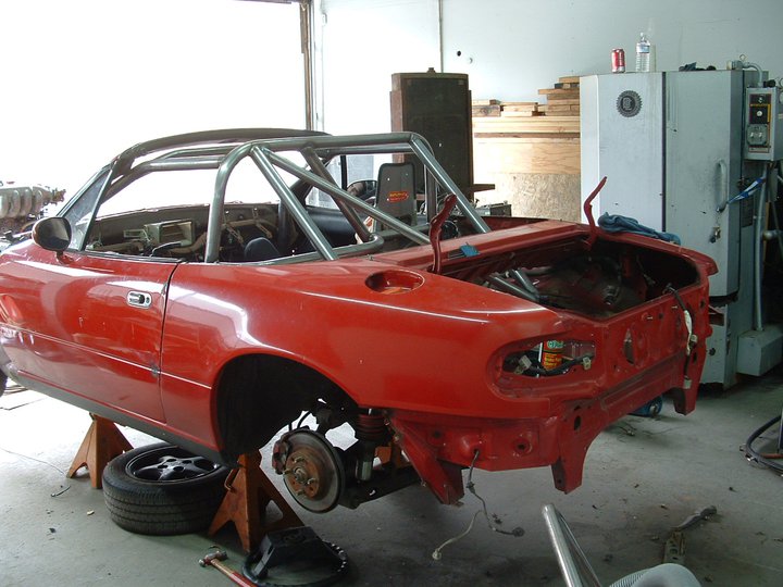 A few shots of my car, the most recent is it sitting on jack stands. I need to snap some new shots, cage is painted, motor is in, turbo, MS...etc all installed. The chrome wheels are when I got it, and some dirt road fun.