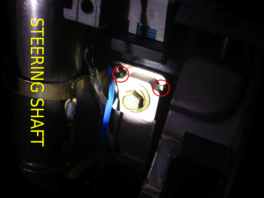 Ok here is a bit of a better picture. I have labelled it to show the steering shaft and the red circles are the points at which when you push the entire steering to either side the pointy things will shift along and touch something causing a sound. I hope its clearer.