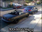 hi all, i joined this forum in hopes of learning more about my currently adquired miata. its a 91, i have to say i only bought this one cause it runs well.. cosmetically it had to be a 4/10 but im working on it. it was embarresing diving it home. she has different rims and some paint fade, primer panels and torn top. not to mention the stock springs were cut and shocks were probably blown. i was jumping out of my seat even at the tinyest pot holes but.. shell rev to 7k all day and love it....