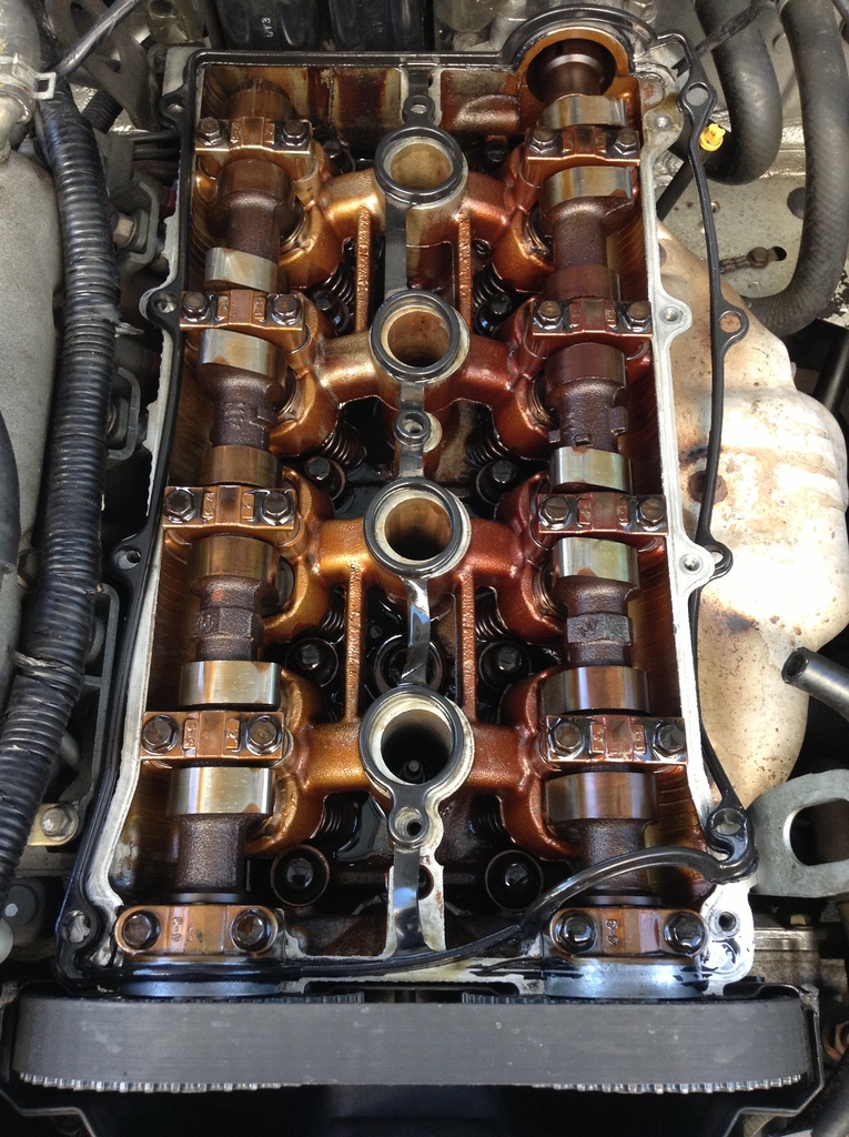 Here's my valve cover off. Smelled a little burnt. Noticeable discoloration on exhaust cam side but the cams themselves still feel smooth.