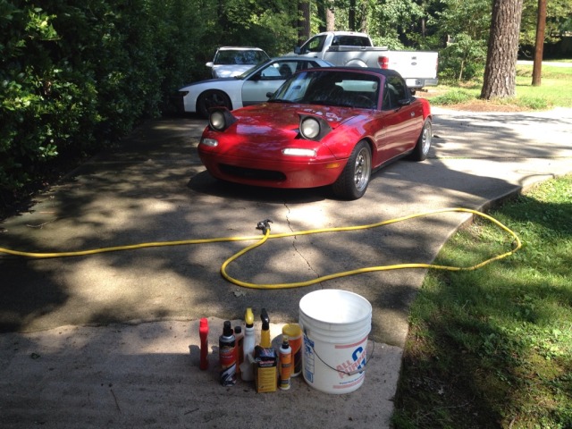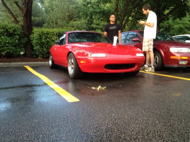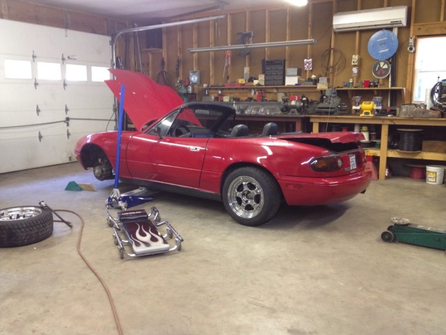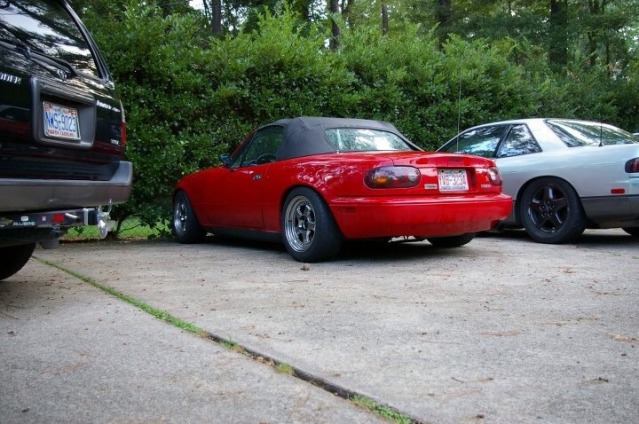 a little back story, I blew the motor in the coupe up a few weeks ago and decided it was time to stop playing around and go big. after a few days i finally decided to sell the wheels off the coupe and pick up a friends miata as i would rather have a driving car then a blown up s13 with some shiny wheels. the car is in pretty good shape, needs a few small things like a driveshaft, tires, and new speakers but that's all pretty easy. As of right now my old plans are to lower it a little more ( the rear is already lower then the front and change out the ds and maybe get a hardtop.
