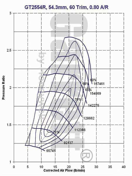At a pressure ratio of 2, which is roughly 15 psi, the greatest efficiency that can be achieved by the 2554 is ~70% and most of that operational area is between 17 and 24 lbs/min of airflow. Remember, airflow is what makes horsepower because air mixed with fuel makes horses. Twice as much air equals twice as much fuel equals twice (roughly) as much power. If we look at the second map, it has a sizable island of 76% efficiency at the pressure ratio of 2 line, which is considerably higher efficiency. And it maintains 75% efficiency or greater at an airflow of around 23 to 32 lbs/minute of airflow, a much greater amount of air.