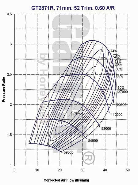 Digging into the big versus little comparison, you can see that the 2554 at a PR of 2 (15psi) is hitting 24 lbs/min maxed out in the 70% efficiency range, but at the same efficiency level the 2871 can hit 24 lbs/min at a PR of 1.5 or about 7.5 psi -- Same airflow, same efficiency level, half the pressure.
