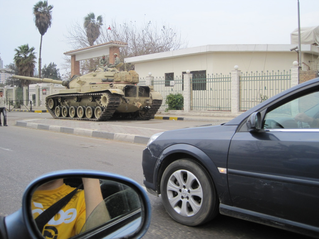 I searched Google images and realized that the pattern painted on the curb is popular in Egypt. This seems to fit well with the surroundings, so I'm going to go with Egypt. Since there is a city in the background and the most popular tourist location in Egypt is Cairo and it also has had a military presence for a while now I am going to guess Cairo Egypt.