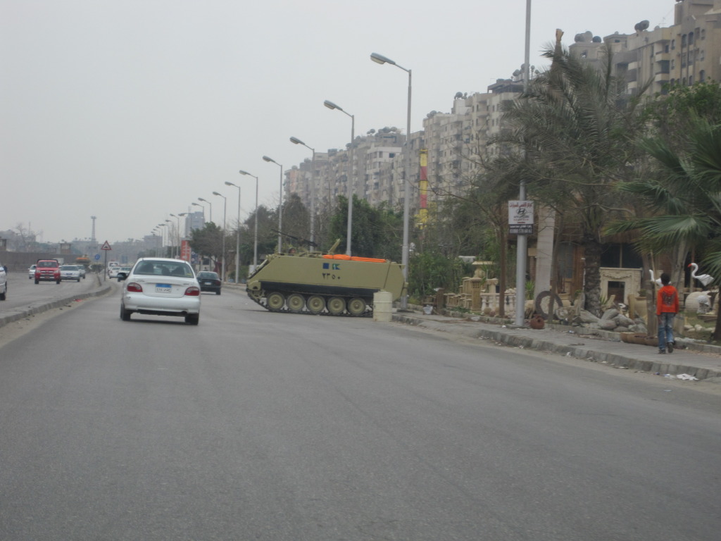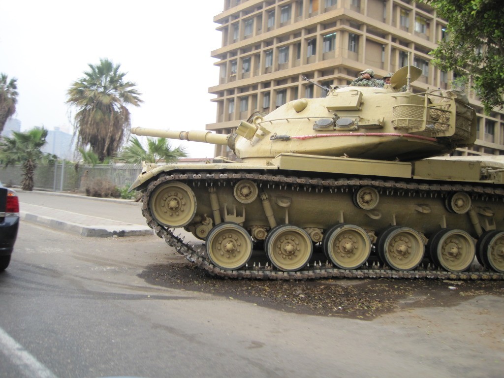 Palm trees so you aren't in the Midwest. There is a reflection on the car of what looks like a desert, hard to tell but looks arabic on the sign, so I'm guessing middle east. Guy on cell phone, so that rules out Afghanistan, you still have your head attached, so that rules out Iraq as it's not fun for tourists just yet, that's not a Ferrari so that rules out Abu Dhabi. I'm not an expert on my tanks, but that looks to be American M1 perhaps so I'm going to guess Kuwait.