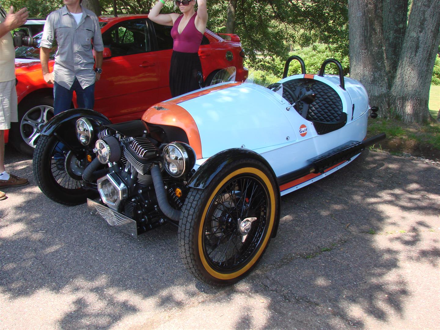 A beautiful Morgan Three Wheeler in gulf livery - Literally brand new with a wood chassis