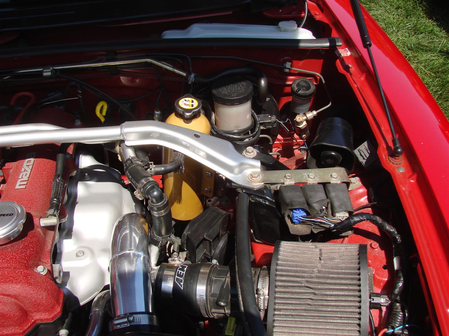 A relocated water expansion tank (green bottle in the bay) and a plastic windshield washer tank from an old japanese car in the cowl area. Also, an interesting mix of BEGI, Corksport and other modifications....all nicely done.