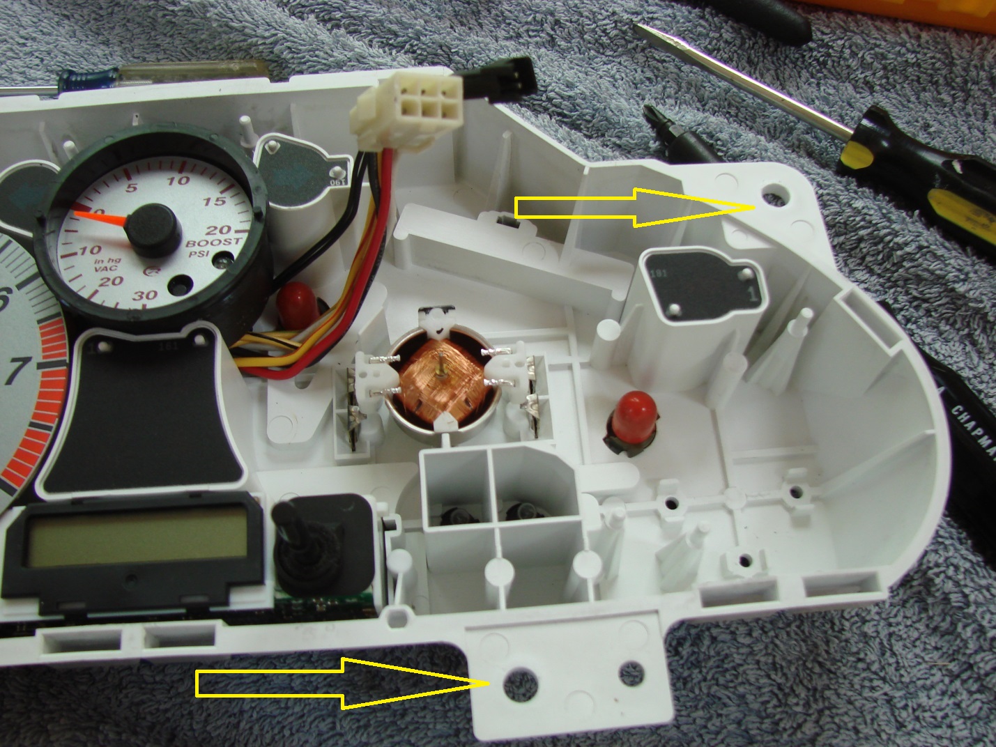 This picture show the cluster partially disassembled, so that you can see the two screw holes in one photo. Simply removing the instrument cluster does NOT require this level of disassembly.