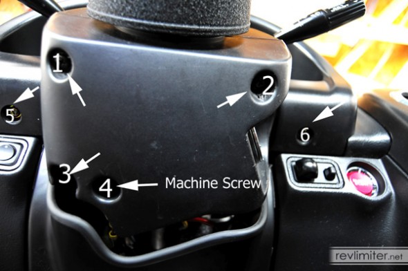 *A. Remove the three or four screws underneath the steering column that hold the two halves of the cover over the ignition lock and headlight and wiper stalks. Mine had three screws and an empty hole.